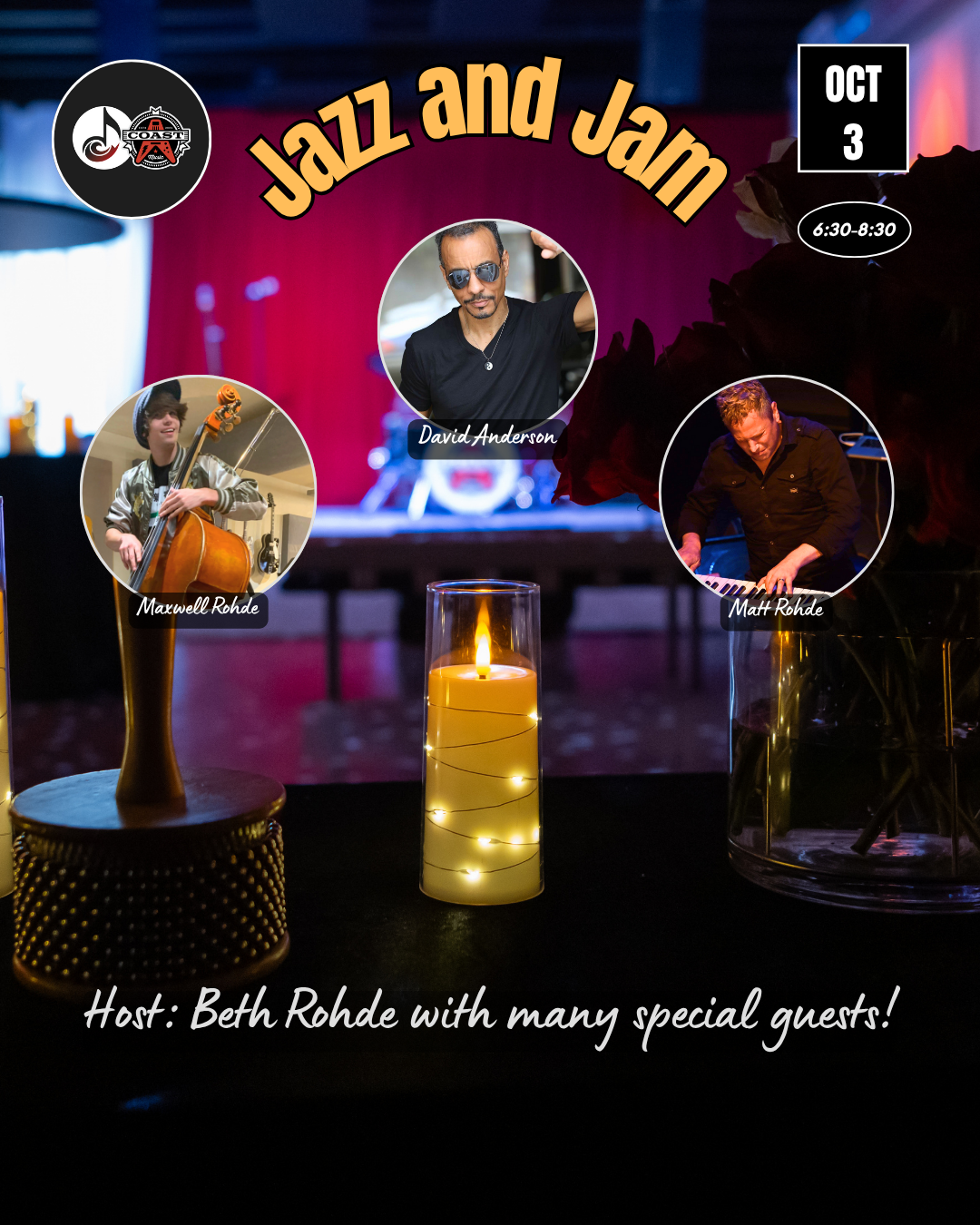 Coast Music 2417 N Sepulveda Blvd., Manhattan Beach, CA, United StatesCome out for some captivating music in a wonderful listening space! This Jazz and Jam features: Matt Rohde who has performed with huge stars such as Prince, Christina Aguilera, Alanis Morrissette and many others. Virtuosic bassist/guitarist, YoungArts winner, Max Rohde (UNT Jazz studies) Amazing drummer, David Anderson who has played with Dione Warwick, Stanley Clarke, Chaka Khan and many [...]
